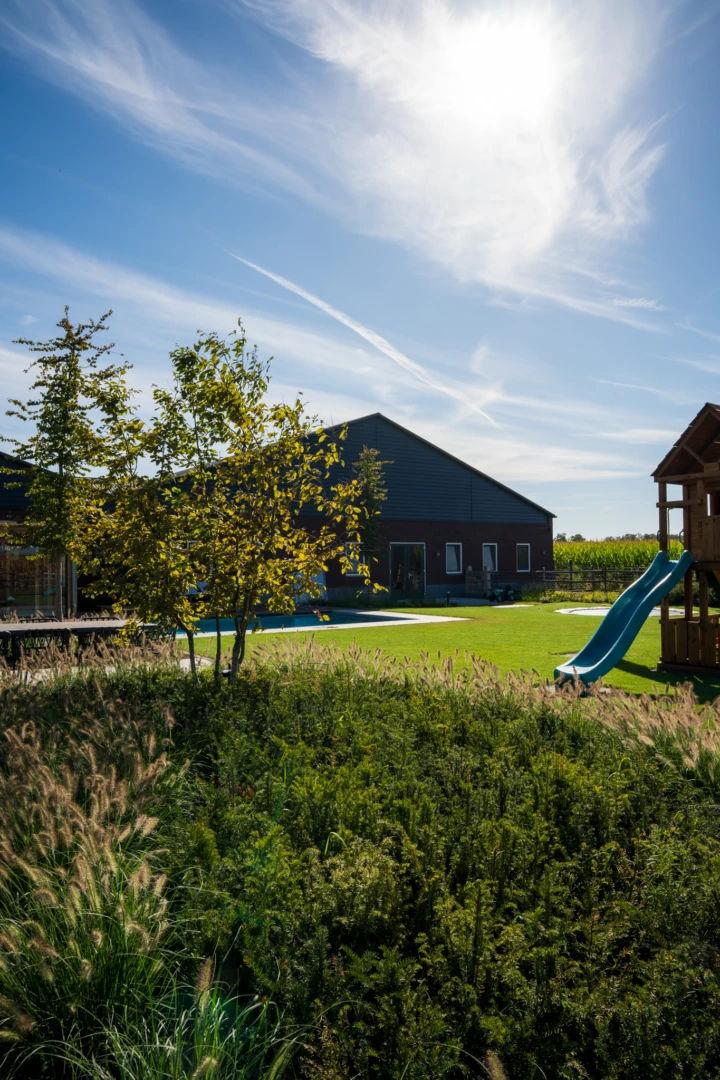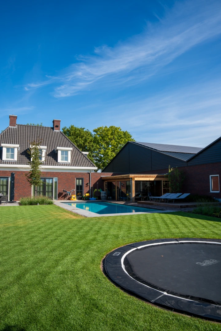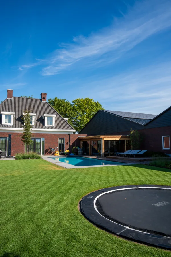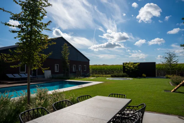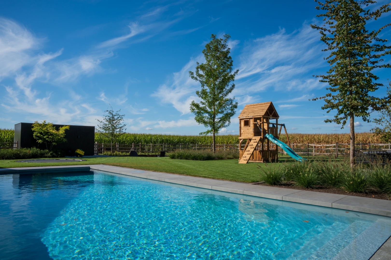 In deze ruime familietuin komen ontspanning, functionaliteit en modern buitenleven samen. Het strakke zwembad vormt het middelpunt, omringd door een royaal terras met comfortabele ligplekken. Het grote gazon biedt volop ruimte om te spelen, met een ingegraven trampoline en een houten speelhuis dat mooi opgaat in de landelijke omgeving.