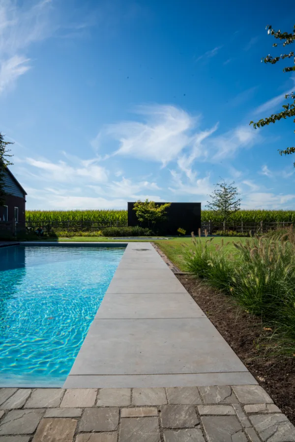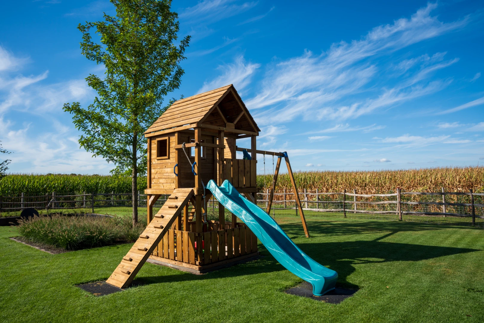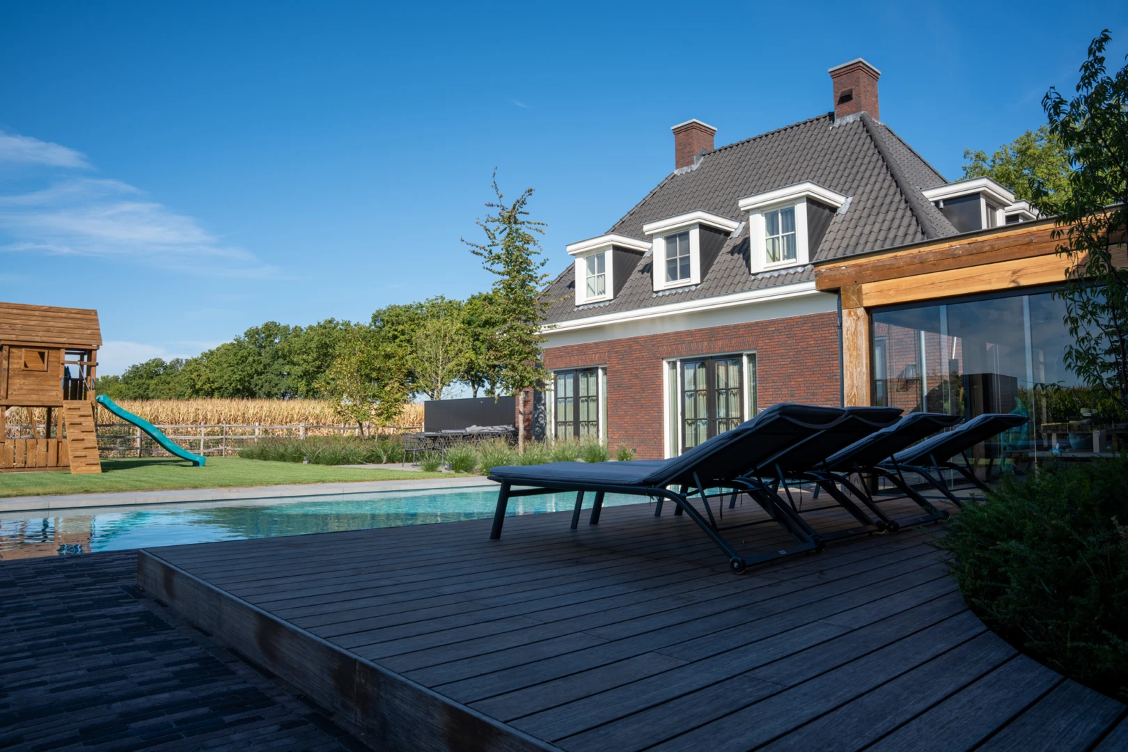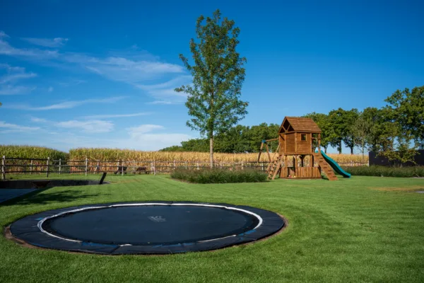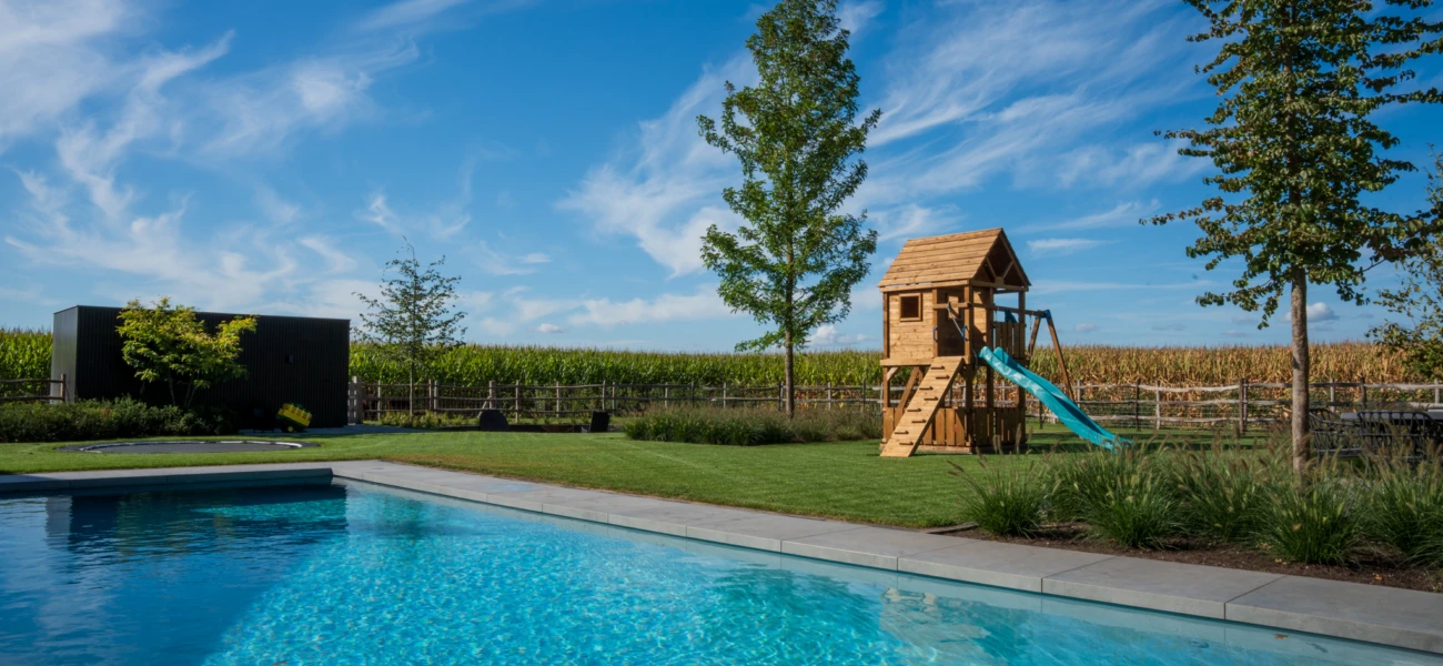 In deze ruime familietuin komen ontspanning, functionaliteit en modern buitenleven samen. Het strakke zwembad vormt het middelpunt, omringd door een royaal terras met comfortabele ligplekken. Het grote gazon biedt volop ruimte om te spelen, met een ingegraven trampoline en een houten speelhuis dat mooi opgaat in de landelijke omgeving.