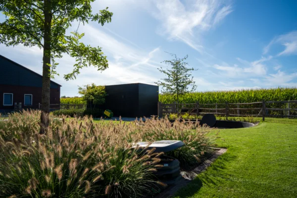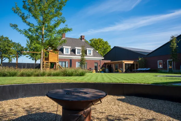 De natuurlijke beplanting en de verdiept aangelegde vuurkolf zorgen voor sfeer en een fijne overgang naar het omliggende landschap. Een moderne, gebruiksvriendelijke tuin waar het hele gezin van kan genieten.