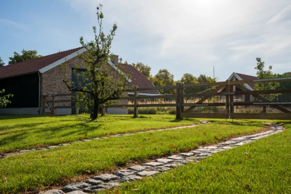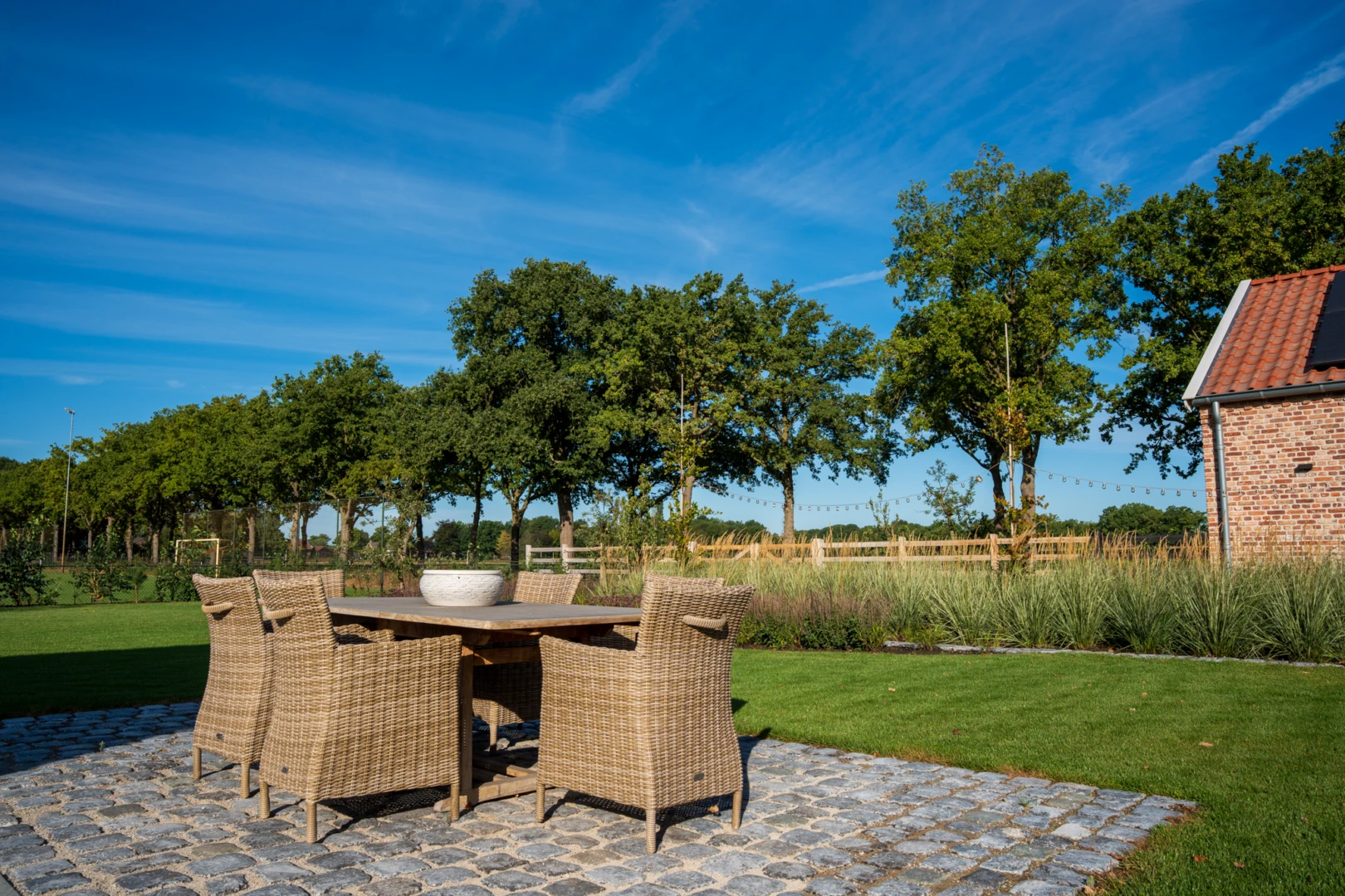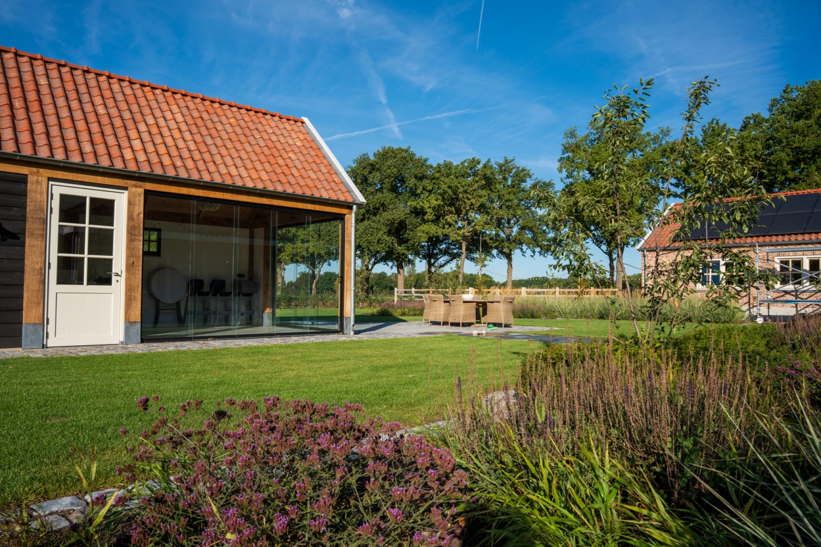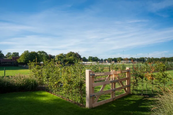 Deze landelijke tuin ademt rust en natuur uit. Een open ontwerp met een karakteristieke houten omheining, een stijlvolle overkapping en knusse zitplekken nodigt uit om te ontspannen en te genieten van het buitenleven.
