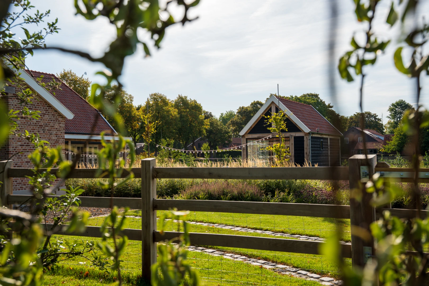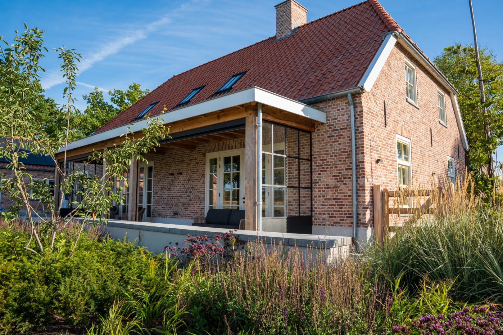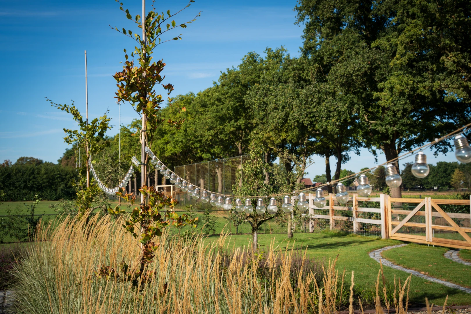 Deze landelijke tuin ademt rust en natuur uit. Een open ontwerp met een karakteristieke houten omheining, een stijlvolle overkapping en knusse zitplekken nodigt uit om te ontspannen en te genieten van het buitenleven.